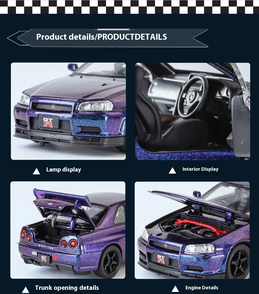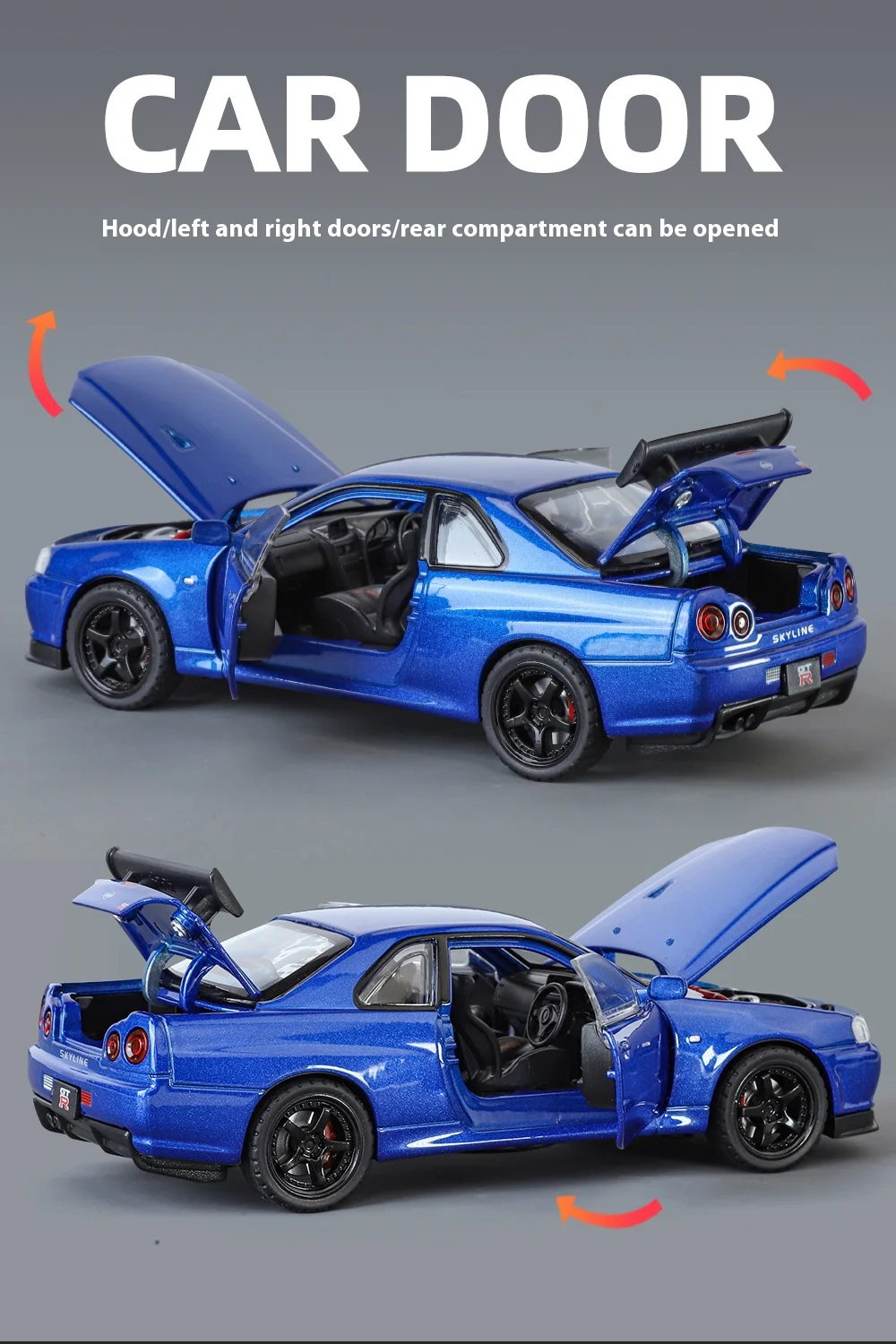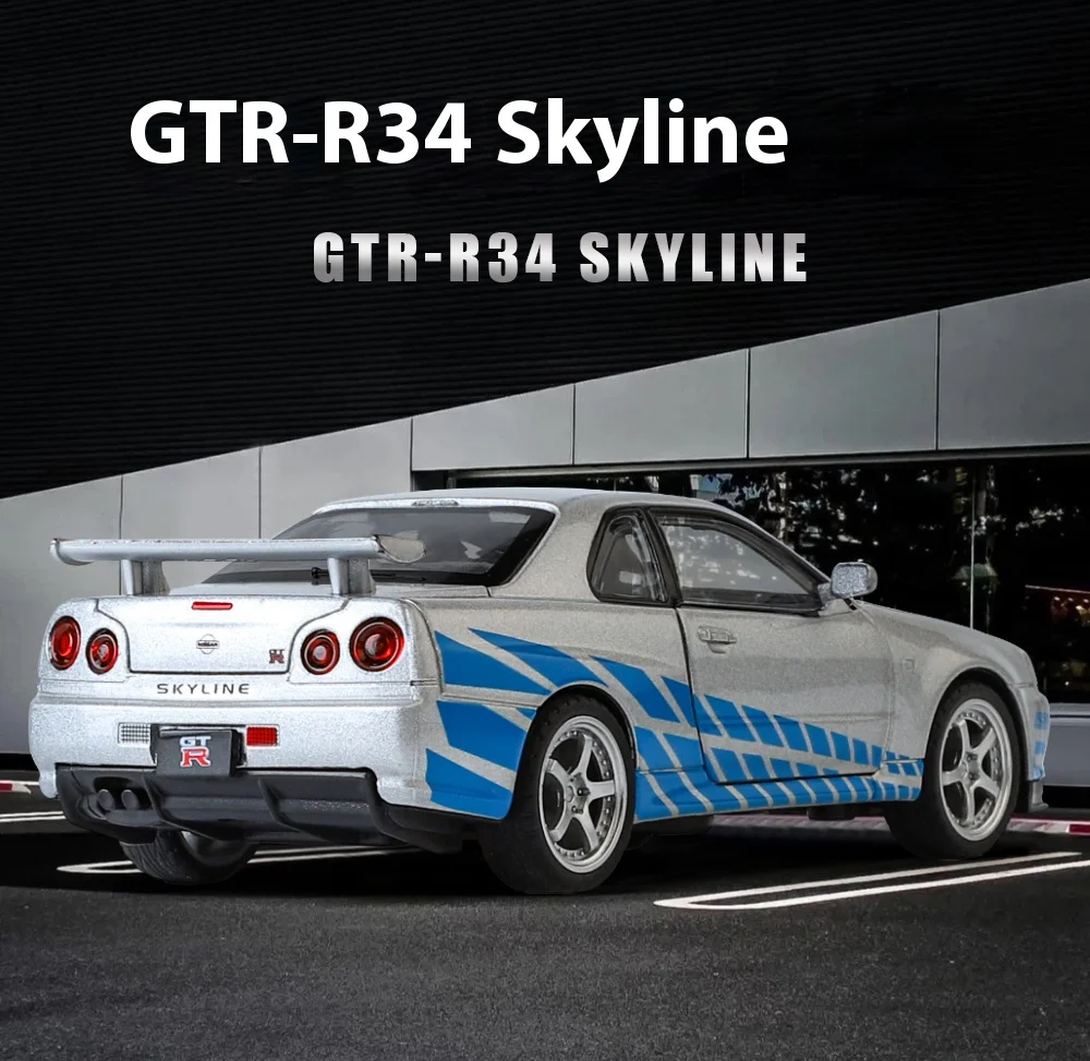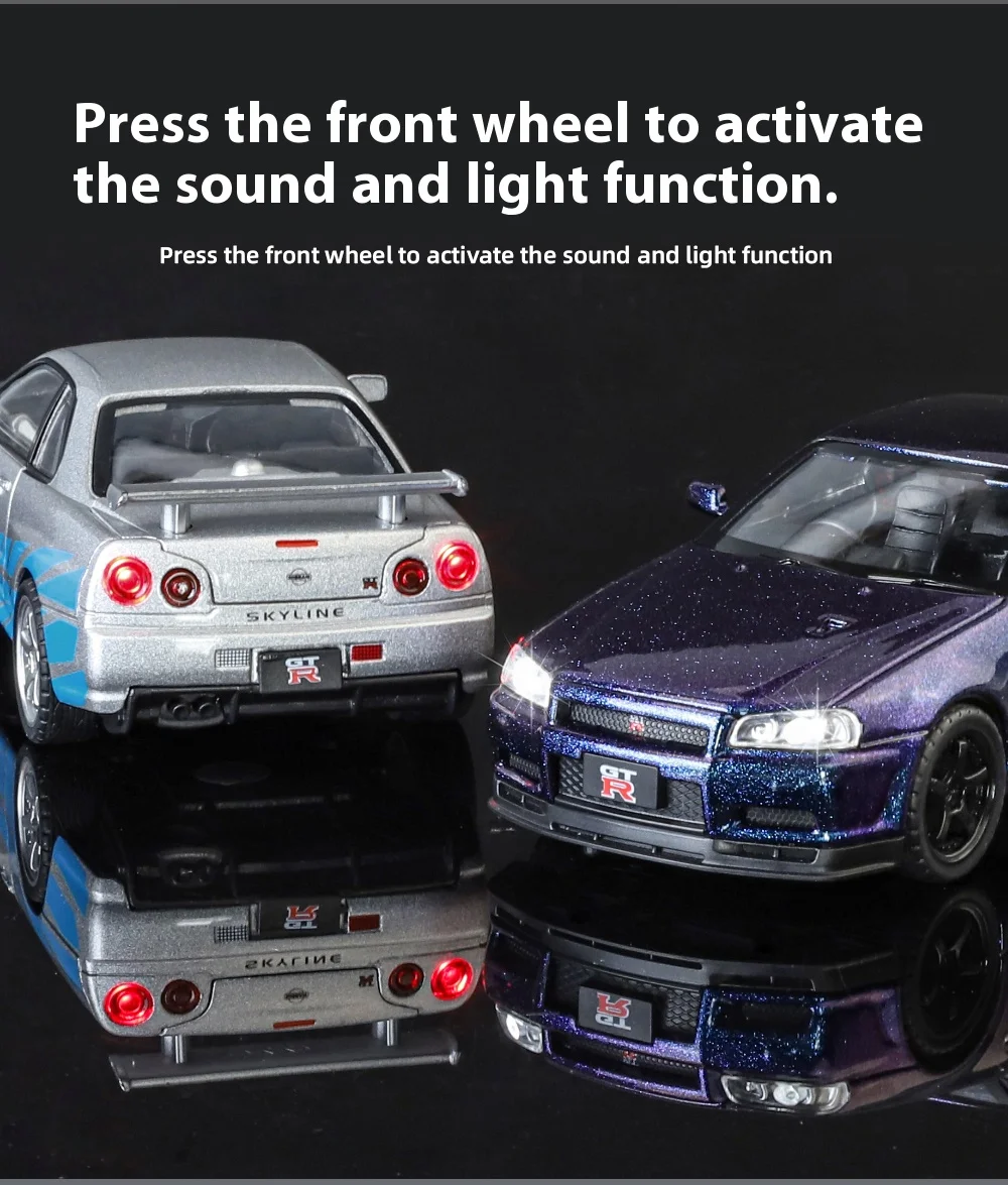 1:32 Nissan GTR R34 Skyline Supercar Alloy Metal Diecast Car Model Sound & Light Collection of Hobby Models Trendy Ornament Gift1:32 Nissan GTR R34 Skyline Supercar Alloy Metal Diecast Car Model Sound & Light Collection of Hobby Models Trendy Ornament Gift